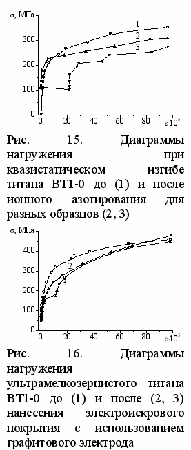 онное азотирование титана и его сплавов используют для повышения износостойкости. При формировании в титане ультрамелкозернистой структуры в нем диффузионные процессы начинают интенсивно развиваться при более низких температурах по сравнению с крупнозернистым материалом. Поэтому были основания предполагать, что ионное азотирование титана может быть реализовано при температурах, не превышающих температуры начала рекристаллизации ультрамелкозернистого титана. Эксперименты показали, что азотирование титана даже в ультрамелкозернистом состоянии начинается только при температурах 820 - 870 К, то есть значительно выше температуры рекристаллизации ультрамелкозернистого титана. При этих условиях формировался ультрамелкозернистый азотированный слой толщиной около 20 мкм с повышенной микротвердостью (до 14 ГПа), причем на поверхности наблюдалось образование тонкой пленки (~1 мкм) из нитрида титана.Отличительной особенностью диаграмм нагружения при квазистатическом изгибе в области микродеформации титана ВТ1-0 после ионного азотирования (рис. 15) является значительный разброс от образца к образцу и скачкообразный характер накопления микродеформации при повышении напряжения, что связано с образованием микротрещин в покрытии.