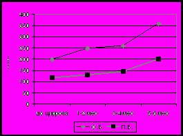 Неизбежным осложнением холестатических заболеваний является нарушение нутритивного статуса, своевременная коррекция которого имеет исключительно важное значение. При использовании лечебного питания с повышенным содержанием СЦТ показано обеспечение более адекватного физического развития и, в том числе, уменьшение дефицита массы тела у детей с тяжелыми прогрессирующими заболеваниями гепатобилиарной системы Степень уменьшения дефицита веса была прямо пропорциональна возрасту ребенка и соответственно длительности болезни (рис 9). Подобные закономерности выявлены при оценке степени экскреции липидов с калом. Отмечалось достоверное снижение уровня липидов в кале, особенно у детей, продолжительность холестаза которых составляла не более 2-х месяцев (рис 9). Следует отметить, отсутствие каких-либо существенных изменений в сывороточном уровне липидов. Полученные результаты позволяют рекомендовать назначение лечебного питания в максимально ранние сроки.