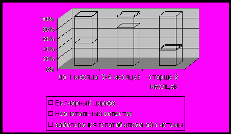 С целью изучения особенностей клинико-лабораторных проявлений в зависимости от возраста проведено динамическое обследование 20 детей с синдромом Алажиля в возрасте от 3 суток до 12 лет жизни и 15 детей с болезнью Байлера в возрасте от 10 дней до 6 лет. Проанализированы результаты обследования и лечения 90 детей с билиарным циррозом в возрасте 11,7+7,3 месяцев жизни (от 4 до 50 месяцев).