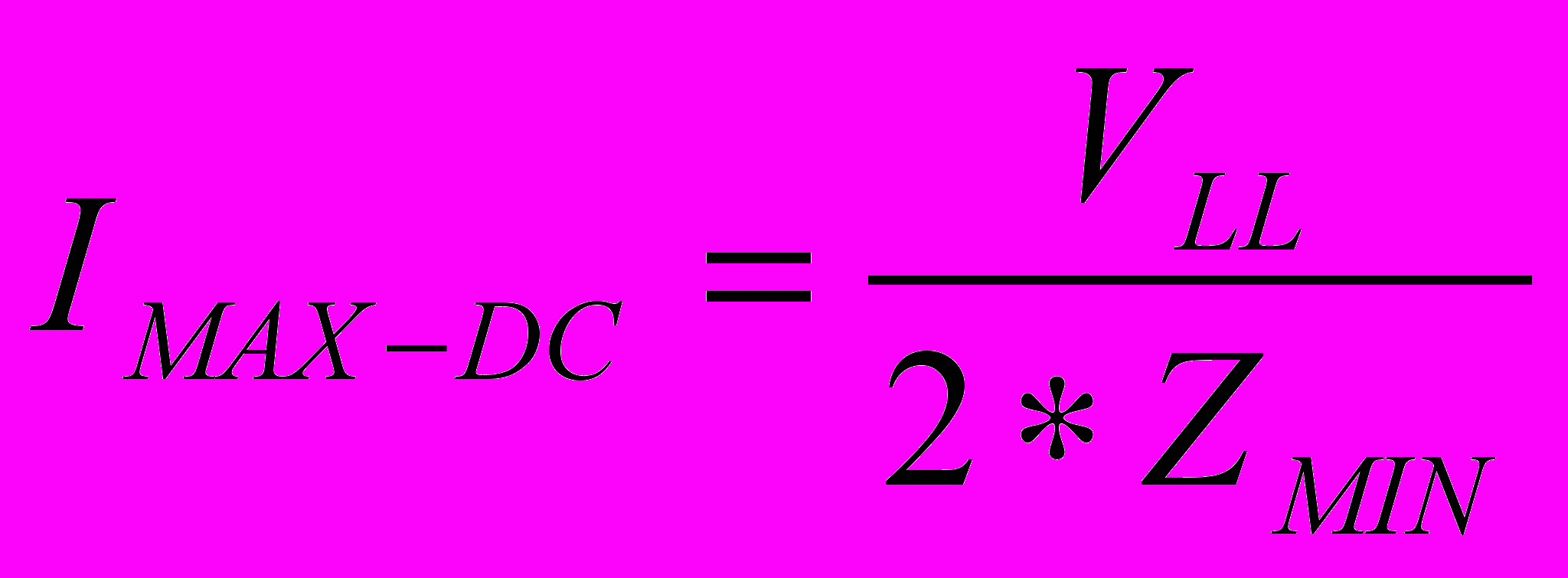 Maximum available current for DC circuits is calculated for a line to line bolted fault using the following equation.