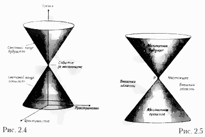 Мы видели, что уравнения Максвелла предсказывают постоянство скорости света независимо от скорости источника и эти предсказания подтверждаются точными измерениями. Отсюда следует, что световой импульс, испущенный в некоторый момент времени из некоторой точки пространства, с течением времени будет распространяться во все стороны, превращаясь в световую сферу, размеры и положение которой зависят от скорости источника. Через одну миллионную долю секунды свет образует сферу радиусом 300 метров; через две миллионные доли секунды радиус сферы увеличится до 600 метров и т. д. Картина будет напоминать волны па воде, расходящиеся по поверхности пруда от брошенного камня. Эти волны расходятся, как круг, расширяющийся со временем. Если представить себе трехмерную модель, два измерения которой на поверхности пруда, а одно – ось времени, то в такой модели расходящийся по воде круг будет «следом» конуса с вершиной, находившейся в момент падения камня в той точке на поверхности пруда, в которой камень коснулся воды (рис. 2.3). Точно так же свет, распространяясь из некоего события в четырехмерном пространстве времени, образует в нем трехмерный конус. Этот конус называется световым конусом будущего для данного события. Можно нарисовать и другой конус, который называется световым конусом прошлого и представляет множество событий, из которых световой импульс может попасть в точку, соответствующую данному событию (рис. 2.4).