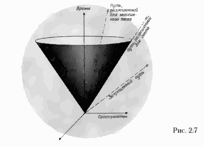 Если пренебречь гравитационными эффектами, как это сделали в 1905 г. Эйнштейн и Пуанкаре, то мы придем к так называемой специальной (или частной) теории относительности. Для каждого события в пространстве времени мы можем построить световой конус (представляющий собой множество всех возможных путей, по которым распространяется свет, испущенный в рассматриваемой точке), а поскольку скорость света одинакова для любого события и в любом направлении, все световые конусы будут одинаковы и ориентированы в одном направлении. Кроме того, эта теория говорит нам, что ничто не может двигаться быстрее света. Это означает, что траектория любого объекта во времени и в пространстве должна представляться линией, лежащей внутри световых конусов для всех событий на ней (рис. 2.7).