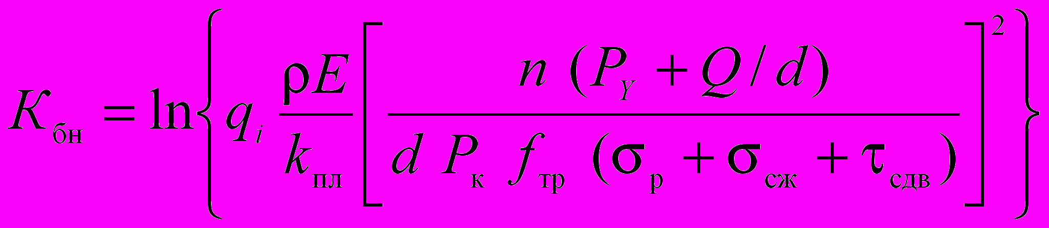(15)где kн – коэффициент неоднородности пород; Mт – линейный модуль трещиноватости массива; Cр – скорость продольной волны в массиве; – КПД взрыва; ВВ – плотность ВВ; WВВ – потенциальная энергия ВВ; r – половина среднего расстояния между зарядами (радиус влияния заряда); L – глубина шпура или скважины; - коэффициент Пуассона; d – диаметр заряда (шпура или скважины); р и сдв – прочность горной породы при растяжении и сдвиге.