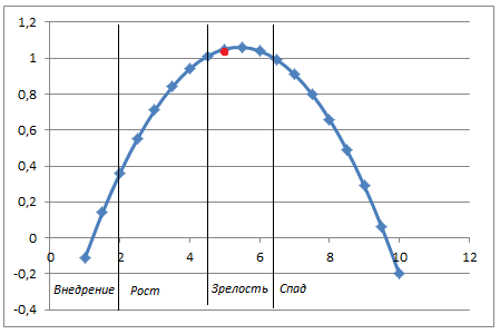 Различают 5 стадий ЖЦТ: внедрение, рост, зрелость, спад.