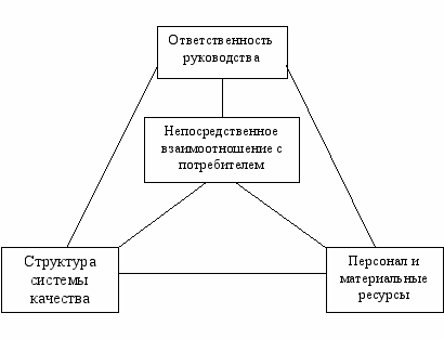 Потребитель занимает центральное место среди трех ключевых аспектов системы качества. На предприятиях сферы услуг, в том числе и на предприятиях общественного питания он также показывает, что удовлетворенность потребителя может быть достигнута только при наличии гармонии во взаимодействии ответственности руководства, персонала и материальных ресурсов, а также структуры системы качества. На рис.5 представлены ключевые аспекты системы качества.