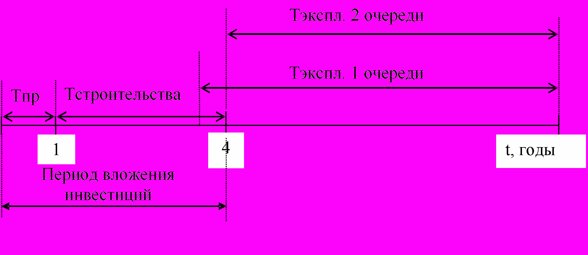 Инвестиции вкладываются в проект в течение периода проектирования и строительства объекта, поэтому если эксплуатация объекта начинается по завершении строительства объекта в целом, инвестиционный период (Т) составляет
