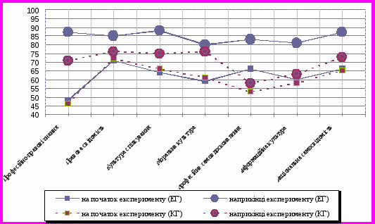 У результаті аналізу даних експериментального дослідження зроблено висновок про динаміку рівнів правової культури у відсотковому відношенні (зростання в обох групах), що відображено на рис. 2.