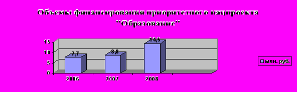 Объём финансирования из всех уровней бюджета на реализацию национального проекта «Образование» в 2008 году составил 14,5 млн. руб. В том числе: из федерального бюджета 9,0 млн. руб., из областного бюджета - 2,5 млн. руб., из районного бюджета – 3,0 млн. руб.