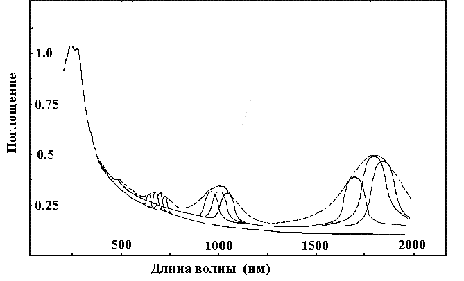 ис. 24. Схема полос поглощения одностенных углеродных нанотрубок.Сразу после экспериментального обнаружения полос Ван-Хова, эти характерные признаки одностенных трубок стали использовать для качественных спектрофотометрических оценок чистоты содержащих нанотрубки образцов. Количественные измерения были затруднены тем, что у исследователей не было образцов с надежно установленным 100% содержанием ОУНТ и тем, что отсутствовала информация о природе фонового поглощения. В частности, предполагалось, что фоновое поглощение обусловлено только частицами примесей, что, как показали наши исследования, не верно. Даже образец, на 100% состоящий из нанотрубок, имеет фоновое поглощение. Поэтому отношение площади полосы Ван-Хова к площади спектра под ней не равно отношению содержания нанотрубок к содержанию примесей. Кроме того, для абсолютных количественных измерений было необходимо знать, как влияет на абсолютную величину поглощения степень агломерации нанотрубок. В данной главе описаны спектрофотометрические исследования влияния Ван-дер-Ваальсовых взаимодействий между трубками на оптические свойства ОУНТ, и влияние на них химической обработки образцов. Эти исследования проводились на взвесях ОУНТ в водных растворах поверхностно активного вещества (цетилтриметиламмониябромида (CTAB), которые получались после ультразвуковой обработки этих смесей. При этом обращалось внимание не только на полосы Ван-Хова, но и на форму фонового поглощения. Проводилось сравнение двух методов очистки: центрифугированием и газофазным окислением. (См. рис. 25) В качестве 100% образца мы использовали образец, очищенный окислением с последующим центрифугированием при 44000g в течении 3 часов.