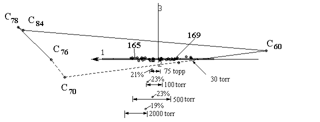 Из приведенных масс-спектров не видно разницы в относительном содержании С60, С70, C76, С78, С84 в экстрактах данных образцов. Это подтверждается статистическим анализом. Самый большой разброс точек по другим направлениям в 14 раз меньшие, чем разброс, вызванный изменениями содержания сверхтяжелых фуллеренов. Если принять, что содержание группы сверхтяжелых меняется от 0 до 100%, что, конечно, является оценкой сверху, то тогда относительное содержание С76, C78 и С84 в данном наборе экстрактов не может меняться более чем на 7%.