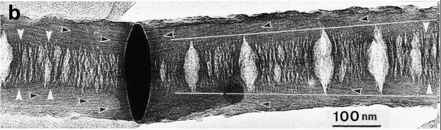 Вдоль оси этого типа би-нитей (диаметром 140 – 260 нм) наблюдаются линзо-образные пустоты, вытянутые поперек нити, - мелкие, много меньше диаметра всей нити, и крупные, с диаметром, почти равным полному диаметру би-нити.