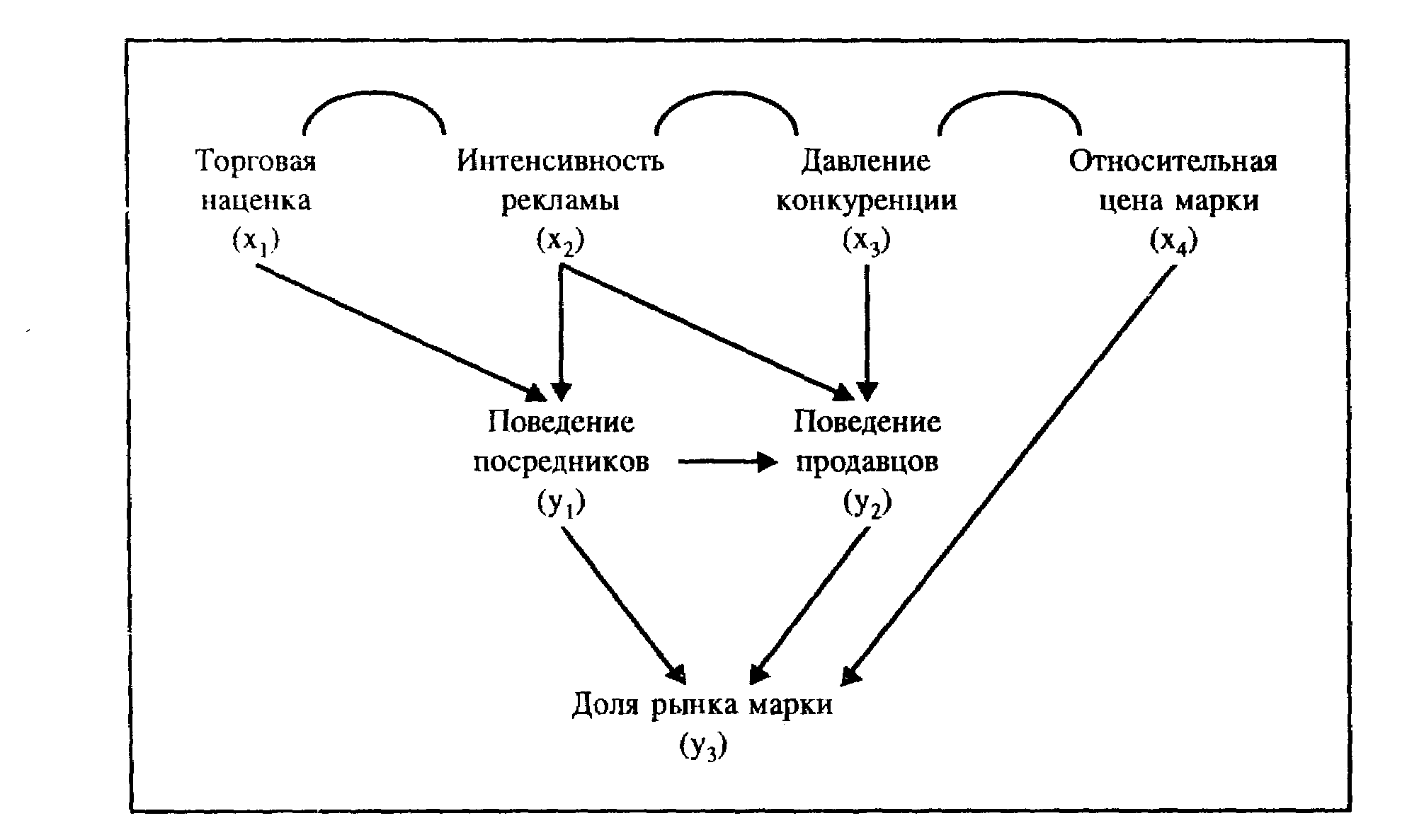- уровень доли рынка (у3) определяется поведением дистрибьюторов (у1), поведением продавцов (у2) и относительным уровнем цены марки (x4).