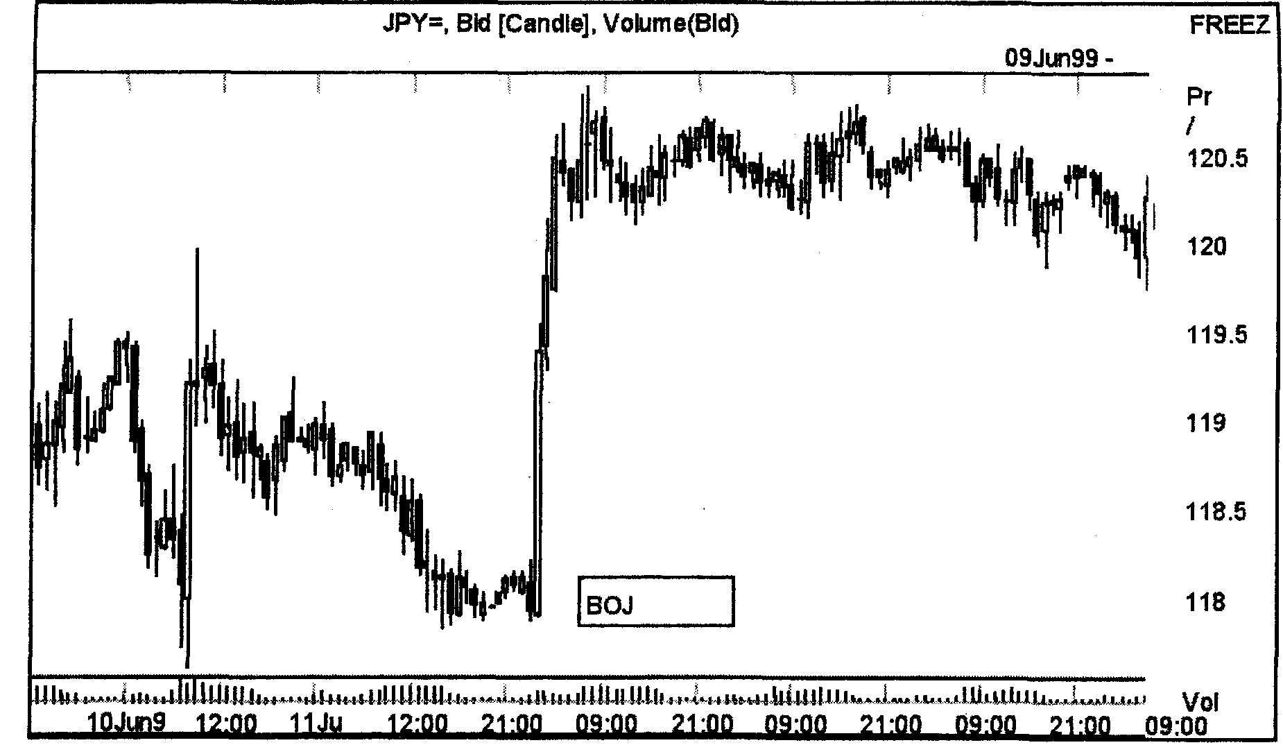 Рис. 8.4. График курса японской йены по отношению к доллару. Реакция на данные по ВВП Японии за первый квартал 1999 г. (10 июня) и две интервенции Банка Японии (10 и 14 июня)