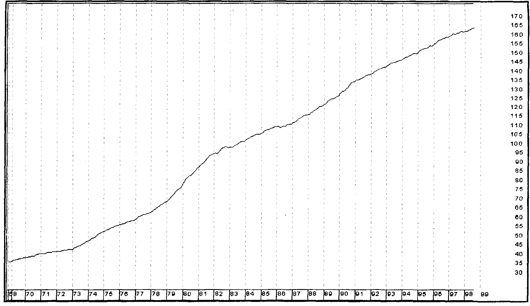 Среднечасовая оплата труда (Рис. 12.2) в середине 1999 года была среди главных ориентиров FED, внимательно следившего за всеми возможными признаками начинающейся инфляции. Рост оплаты труда, опережающий производительность, сигнализировал бы об опасности роста цен, что для рынка тогда служило подтверждением готовности FED поднять ставки по федеральным фондам.