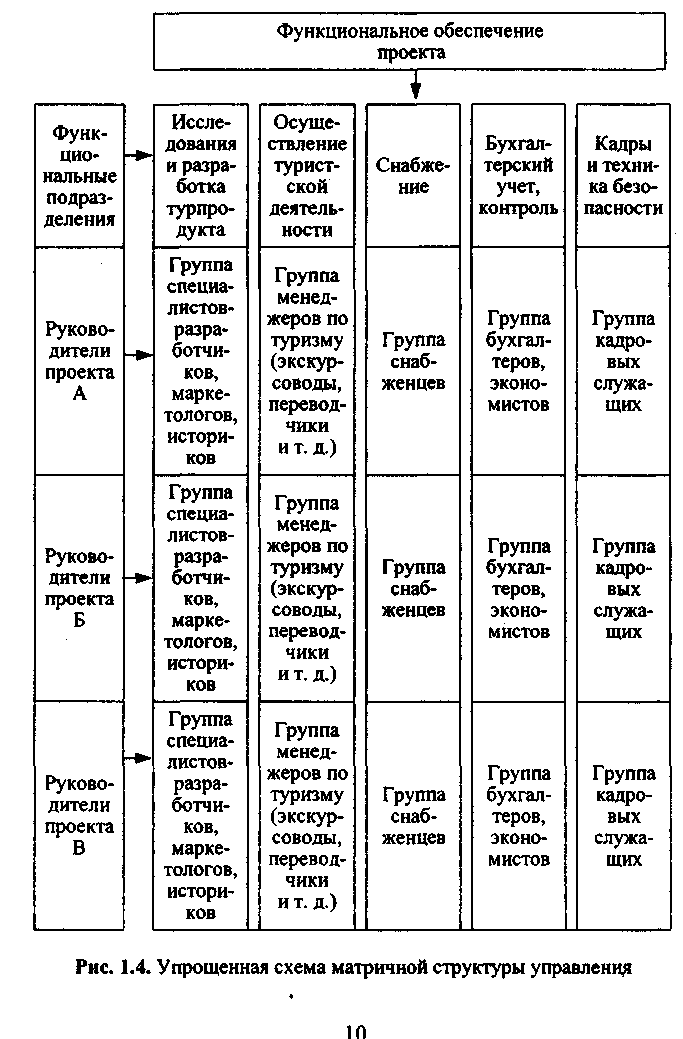 5. Матричная организационная структура управления. Наиболее эффективна в условиях наукоемких производств, характеризующихся частой сменой объектов разработки и внедрения, высокими уровнями квалификации кадров и творческого потенциала, хорошей технологической оснащенностью производства, наличием развитой опытной производственной базы и серийного производства (рис. 1.4). Однако в условиях активизации инновационных процессов может быть успешно применена в других сферах, в частности в турбизнесе.