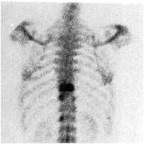 Сцинтиграмма грудной клетки человека (темные пятна – костные метастазы)