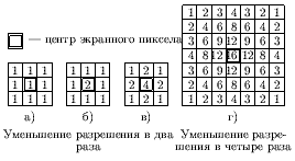 Простейшее усреднение - равномерное (рис. ). Улучшить усреднение можно за счет использования весов, задающих влияние отдельных подпикселов на атрибут пиксела экрана (см. рис. ).