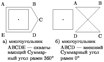 Если суммарный угол равен 0, то многоугольник - внешний. Если же угол равен N×360, то многоугольник охватывает окно N раз. Простейшая иллюстрация этого теста приведена на рис. 0.6.51.