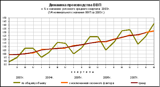 Знание значений реального ВВП за ряд периодов позволяет изучить динамику ВВП путем исчисления его индексов физического объема. На рис. 6.1. показана динамика производства реального ВВП, в том числе с исключением сезонного фактора. Объем ВВП России за 2007 г. составил в текущих ценах 32988,6 млрд.рублей, темп роста его реального объема относительно 2006 г. – 108,1%, индекс-дефлятор ВВП в 2007 г. по отношению к ценам 2006 г. составил 113,5%.