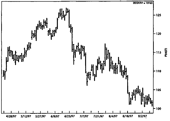 Есть несколько способов измерения этой величины. Вы могли бы использовать средний диапазон для некоторого числа последних дней, различных точек разворота и т.п. Вообще говоря, я нашел, что использование одного лишь вчерашнего диапазона для сравнения волатильности просто творит чудеса. Скажем, вчерашний диапазон по пшенице был 12 центов. Если сегодняшний диапазон превышает этот диапазон на определенный процент, тренд, вероятно, изменился. По крайней мере можно подумать о том, чтобы сделать на это ставку. Это могло бы быть ясным указанием, что цена получила новый толчок, ведущий к ее развитию в определенном направлении, и она, подобно любому объекту, однажды приведенному в движение, стремится придерживаться направления этого движения.