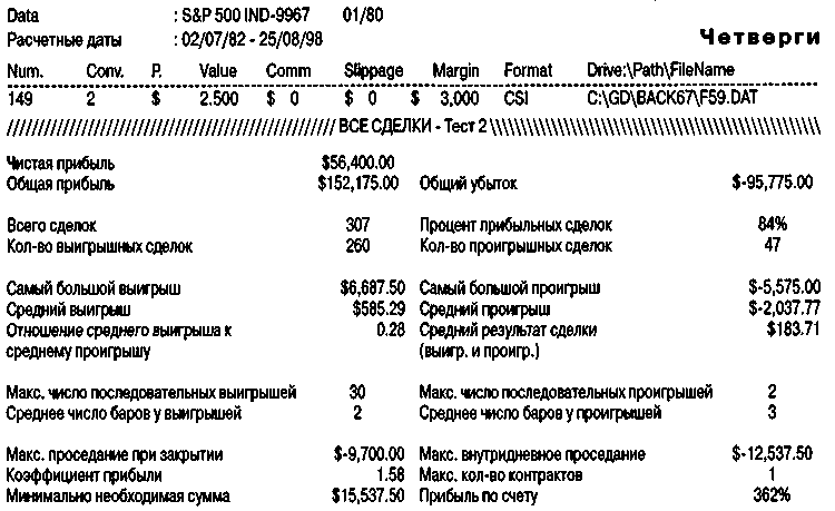 сделок и повысим нашу среднюю прибыль до $173 — суммы, ради которой стоит торговать. Мораль в том, что применение концепции торгового дня недели (TDW) может оказать большое влияние на производительность вашей системы. Более того, проседание резко снижается: с $10,031 до всего $3,500, а точность подскакивает к 84 процентам. Это большое улучшение, как будет объяснено далее при обсуждении темы управления капиталом в главе 13.