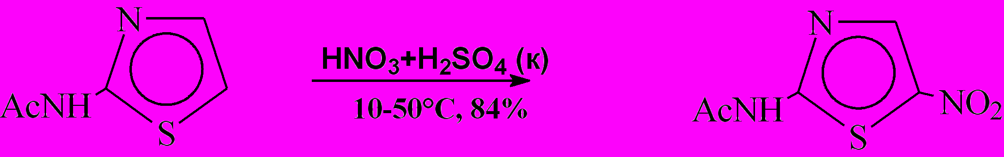 2-Ацетиламинотиазол в производстве нитазола нитруется еще легче при температуре от 10-12°С до 45-50°С. Нитрование ведут серно-азотной нитрующей смесью, приготовленной из концентрированной H2SO4 и 59%-ной HNO3 (избыток HNO3 равен 10%)