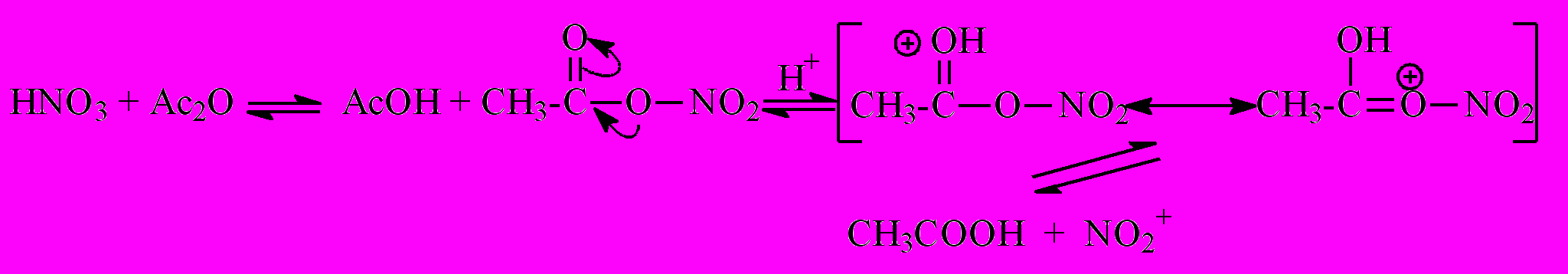 Нитрующие частицы образуются при взаимодействии уксусного ангидрида с концентрированной азотной кислотой. При этом реакция катализируется добавлением каталитических количеств серной кислоты:
