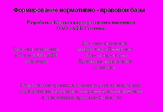 - совершенствование сложившейся системы корпоративного управления в АФК «Система» в целях ее приведения в соответствие с российскими и международными стандартами;