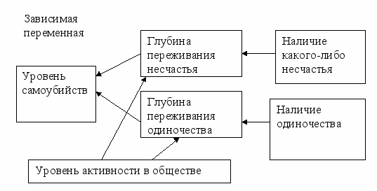 В исследовании Э.Дюркгейма, о котором шла речь выше, «уровень самоубийств» является зависимой переменной, а независимыми переменными выступают такие факторы, как «глубина переживания одиночества», «глубина переживания своего несчастья», «уровень активности в обществе», «одиночество», «несчастье» (Рис.3). Можно попробовать построить модель взаимодействия таких переменных, как если бы они были соответствующими вопросами или индикаторами в вопроснике. Очевидно, что переменная «уровень активности в обществе» (как и переменные «несчастье», «одиночество»), хотя и коррелирует с уровнем самоубийств, но связана с ним, скорее всего, не непосредственно, а через переменные, отражающие глубину переживания стрессовых факторов.