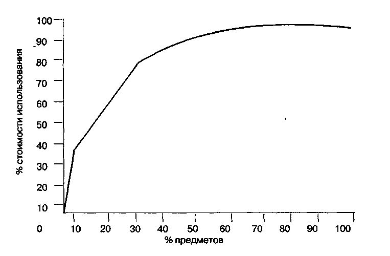 Удобным способом классификации предметов хранения является правило Парето , или АВС-анализ (известный также как правило 80/20). Все предметы хранения ранжируются по степени убывания их использования в стоимостном выражении, после чего строится кумулятивная кривая плотности распределения (см. рис. 8.9 и исходные данные в табл. 8.1).