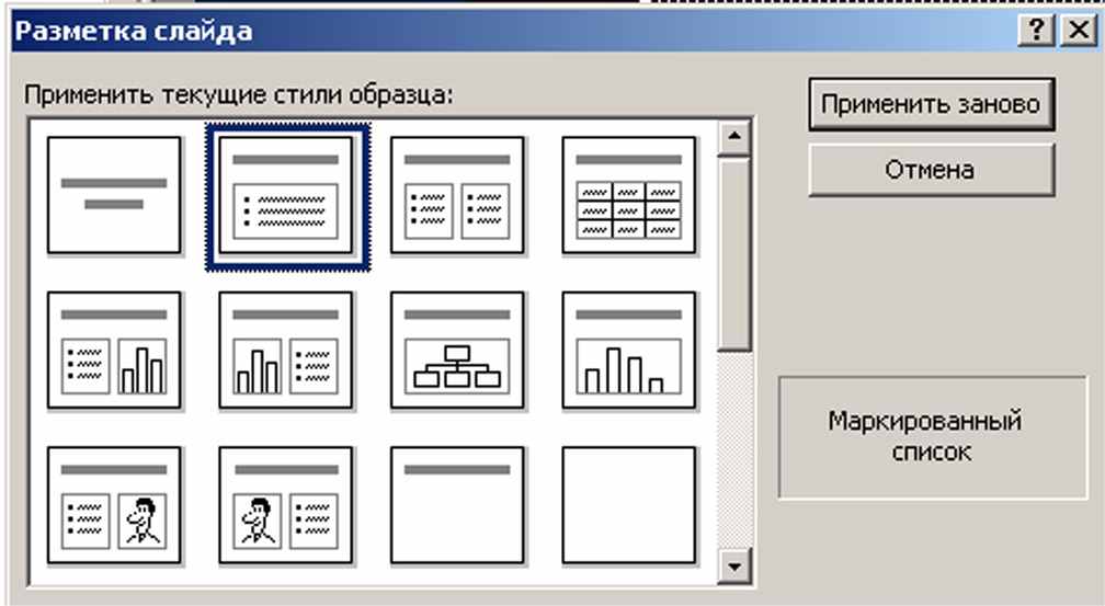 Рис. 10. Выбор новой разметки в диалоговом окне Разметка слайда