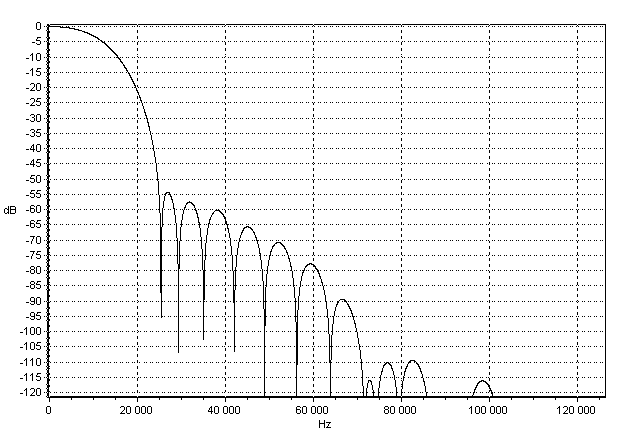 Таким образом можно получить коэффициенты фильтра, обеспечивающие необходимую форму его АЧХ. В данном случае фильтр должен был обеспечить прохождения сигнала с частотой до 10 кГц с минимальным подавлением (не более 3 дБ), а с частотой до 20 кГц с подавлением 22 – 23 дБ. Более высокие частоты должны быть подавлены не менее, чем на 50 дБ. С помощью программы MFStudio можно просмотреть результат – АЧХ спроектированного фильтра (рис. 1).