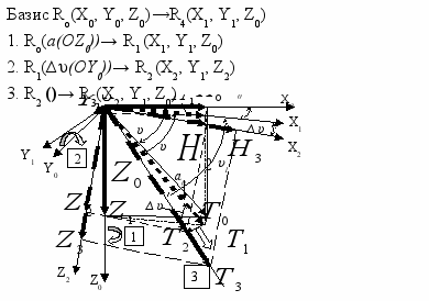 ис. 5. Преобразования координат, характеризующиеся поворотом горизонтальной составляющей Н0 полного вектора напряжённости ГМП