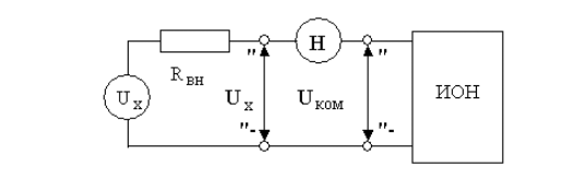 При выполнении измерений с помощью потенциометра измеряемая величина, сравнивается с мерой, в качестве которой выступает образцовое компенсирующее напряжение, создаваемое регулируемым источником образцового напряжения. В электрической схеме этот источник включается встречно с источником измеряемого напряжения.