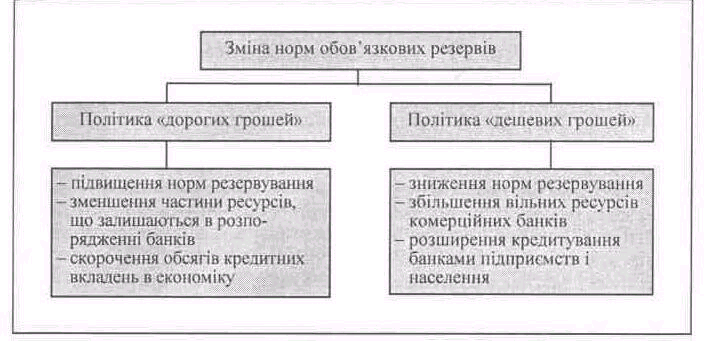 Зміна норм обов'язкових резервів регулює ресурси комерційних банків, що їх вони зобов'язані зберігати в центральному банкові. Сума коштів, що зберігаються, встановлюється у певному процентному відношенні до величини депозитів банку.
