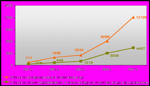 Позитивна тенденція розвитку ринку лізингу знаходить свій прояв у рості кількості укладених лізингових угод (діаграма 7). У 2007 році було укладено 12 105 угоди, що на 98% більше, ніж у 2006 році (6089 угод).