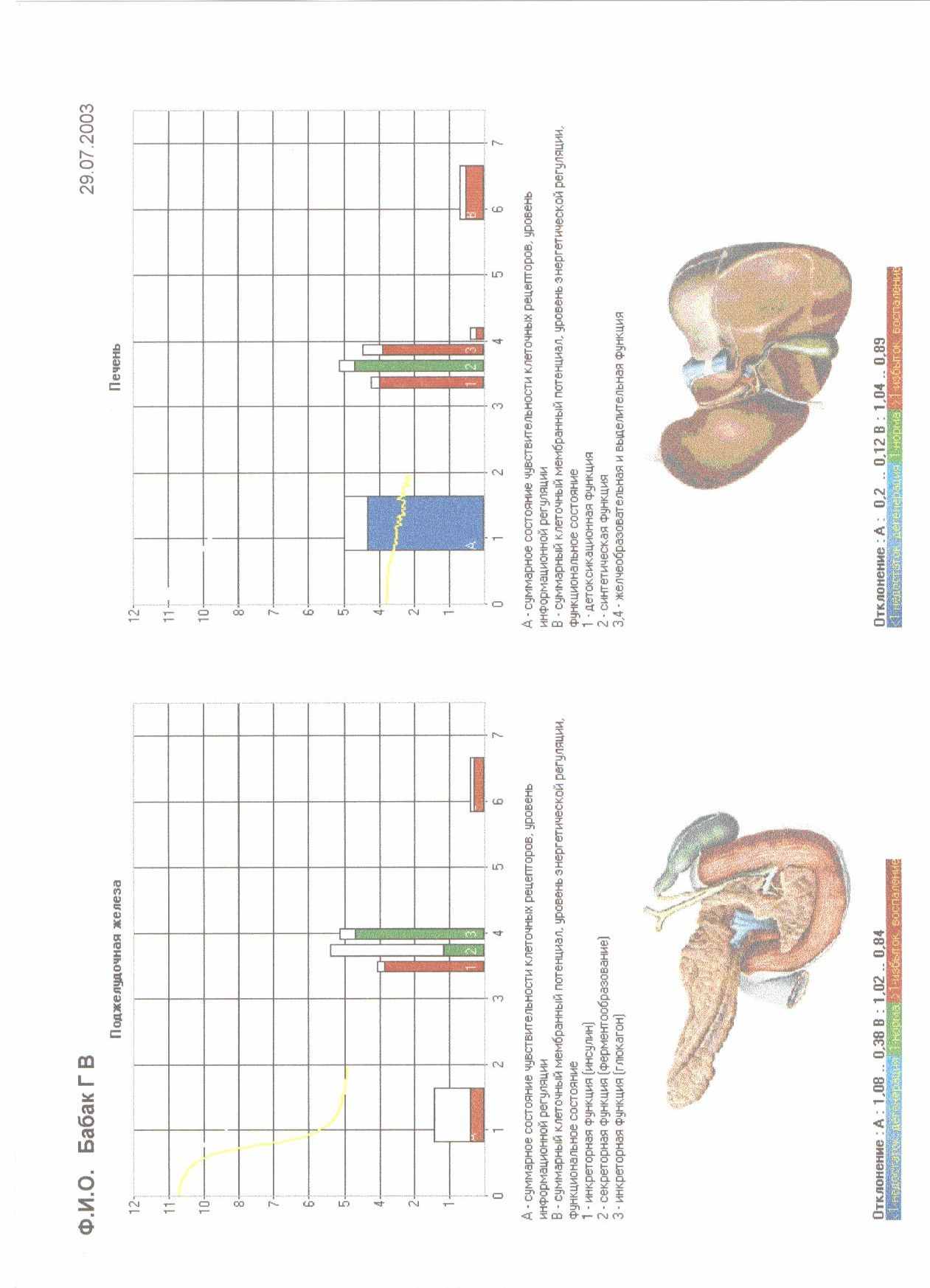 Примечание: этот и нижеследующие рисунки представлены в соответствии с графическими изображениями компьютерного обеспечения аппаратно–программного комплекса «Intera Vector-BIOPSI-Diacor» в режиме «Органы». Обозначения цвета столбцов: зеленый (зел.), красный (кр.), синий (син.). В-суммарный «мембранный потенциал»; А – суммарная восприимчивость клеточных рецепторов.
