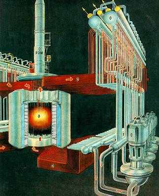 Ядерная реакция протекает в активной зоне реактора, которая заполнена замедлителем и пронизана стержнями, содержащими обогащенную смесь изотопов урана с повышенным содержанием урана-235 (до 3%). В активную зону вводятся регулирующие стержни, содержащие кадмий или бор, которые интенсивно поглощают нейтроны. Введение стержней в активную зону позволяет управлять скоростью цепной реакции. Активная зона охлаждается с помощью прокачиваемого теплоносителя, в качестве которого может применяться вода или металл с низкой температурой плавления (например, натрий, имеющий температуру плавления 98°C). В парогенераторе теплоноситель передает тепловую энергию воде, превращая ее в пар высокого давления. Пар направляется в турбину, соединенную с электрогенератором. Из турбины пар поступает в конденсатор. Во избежание утечки радиации контуры теплоносителя I и парогенератора II работают по замкнутым циклам.