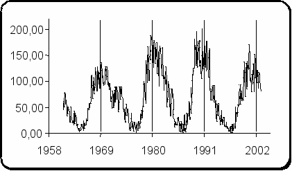Единого универсального показателя для активности Солнца не существует, но в солнечно-земной физике установлено, что можно указать величины, которые позволяют в какой-то степени приблизиться к решению этой задачи. Одной из этих величин является интенсивность радиоизлучения Солнца на волне 10,7 см, которая также обладает примерно той же периодичностью, что и числа Вольфа. Многочисленные исследования показали, что вариации и этого, и многих других показателей с приемлемой точностью кореллируют с числами Вольфа. Поэтому во многих исследованиях по солнечно-земным связям проводится сопоставление наблюдаемых в различных оболочках Земли явлений с поведением солнечной активности, ход которой представлен на рис. 1.2. Впрочем, для более точных количественных оценок используется и интенсивность радиоизлучения на волне 10,7 см. Кстати сказать, именно на эту длину волны настроены приемники радиополигона «Орбита», модернизация которого была одним из существенных элементов научной части Государственной программы «Развитие космической деятельности в Республике Казахстан на 2005-2007 гг.»