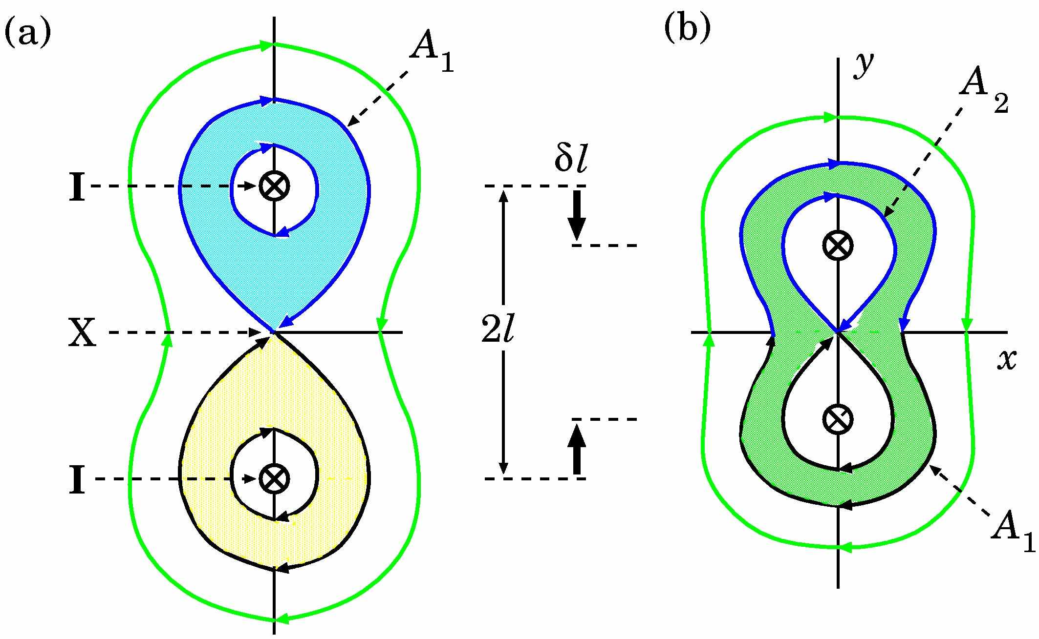 Рассмотрим простейший пример, который демонстрирует сущность явления. Поместим два прямых проводника на расстоянии 2l друг от друга. Пусть по каждому из них течет электрический ток I. Тогда магнитное поле этих токов образует три различных магнитных потока (рис. 6a). Два из них (показаны синим и желтым цветом) принадлежат соответственно верхнему и нижнему токам; каждый поток охватывает свой проводник. Они расположены внутри сепаратрисной линии поля A1 , которая образует «восьмерку» с точкой пересечения типа буквы X (далее X-точкой). Третий поток расположен вне сепаратрисы; он принадлежит одновременно обоим токам. Зеленым цветом показана одна из линий поля общего магнитного потока двух токов.