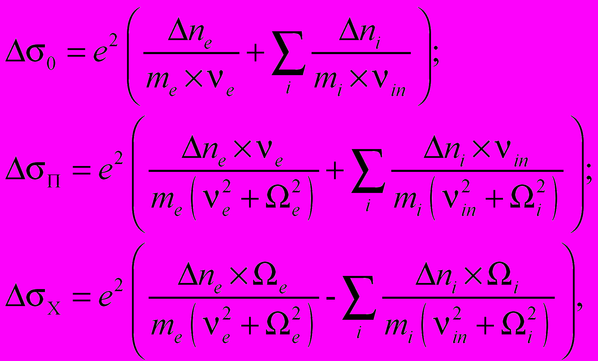 где e – заряд электрона, me – масса электрона, mi – масса иона, ve – частота соударения электронов и нейтралов, vin – частота соударения ионов и нейтралов, Ωe – гирочастота электронов, Ωi – гирочастота ионов.
