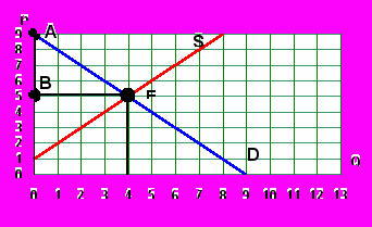 Пусть функция спроса представлена в виде уравнения Qd=9-P, а функция предложения — Qs=-1+P. Тогда равновесная цена будет равна 5 единицам (например, рублям), а равновесное количество — 4 единицам (например, килограммам). Проиллюстрируем спрос и предложение в табличном и графическом виде: