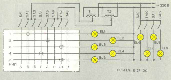 Принцип действия СМИ "Харьков" рассмотрим по схеме на рис. 37. Его БУМ выполнен на шести автотрансформаторах типа ЛАТР-1М (на схеме показаны только два канала управления). Мощность одного канала - 2 кВт. К каждому автотрансформатору выключателями SA1 — SA4, SA5 - SA8 и посредством наборной коммутационной панели НКП можно подключить любую проекционную ячейку ВОУ или группу ячеек (с лампами ЕЫ - ELS) во всевозможных комбинациях. Панель представляет собой коммутационное поле, вертикальные линии которого штекерами можно замыкать с горизонтальными.