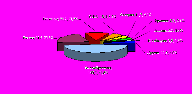 Рассмотрим показатель относительной диверсификации размещения рисков на международных рынках перестрахования. Он характеризуется структурой премий, уплаченных по договорам перестрахования с иностранными страховщиками (перестраховщиками) страховщиками-резидентами. Так, за первое полугодие 2006 года общая сумма перестрахования у нерезидентов составляет 295, 4 млн. долларов, а структура переданных перестраховщикам-нерезидентам страховых платежей (с указанием объемов в млн.грн. и % от общих премий, уплаченных нерезидентам) по разным странам представляет (рис.6):