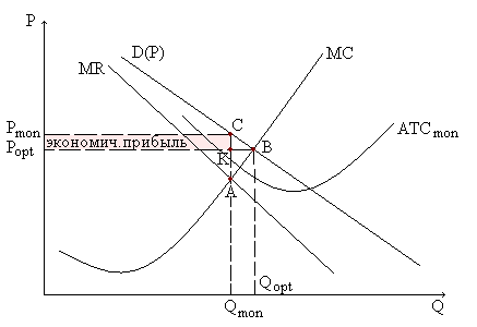 Qmon и Pmon фиксируют уровень оптимизации, отвечающий интересам предпринимателя, а Qopt и Popt фиксируют уровень оптимизации, отвечающий интересам общества, потребителей. Интересы предпринимателя и общества не совпадают. Максимум экономической прибыли достигается предпринимателем при меньшем объёме выпуска (Qmon ) и при более высокой цене (Pmon ).