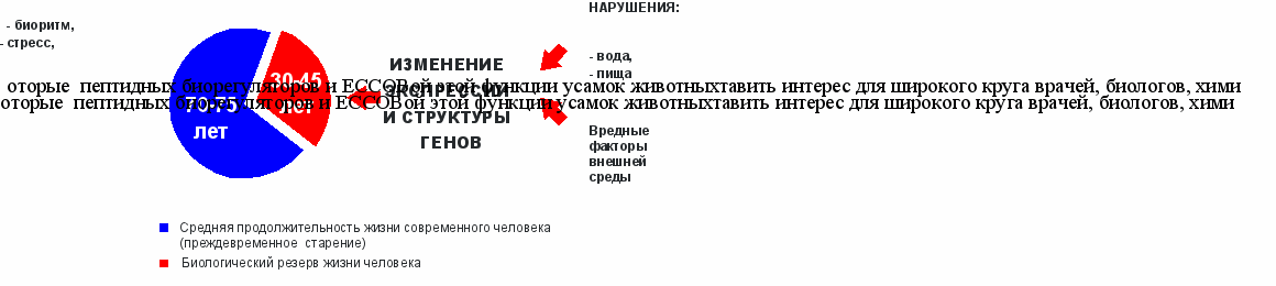 Известно, что видовой предел продолжительности жизни животных и человека примерно на 30-40% превышает среднюю длительность жизни. Это связано с воздействием на организм различных неблагоприятных факторов, которые приводят к изменению экспрессии и структуры генов, что сопровождается нарушением синтеза белка и снижением функций организма (рис. 1) [1, 22, 35, 39].