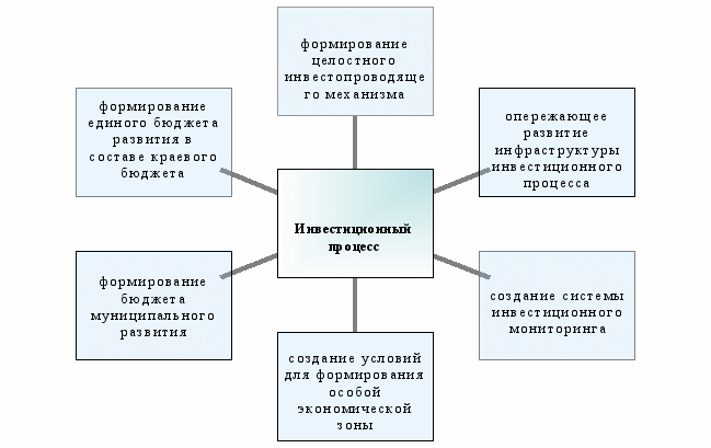 - совершенствование государственного управления инвестиционным процессом в регионе основывается в следующих направления: формирование целостного инвестопроводящего механизма; опережающее развитие инфраструктуры инвестиционного процесса; создание системы инвестиционного мониторинга; формирование финансово-информационной базы единого бюджета развития в составе краевого бюджета как предпосылки качественно нового инвестиционного института; формирование бюджета муниципального развития; создание условий для формирования особой экономической зоны.