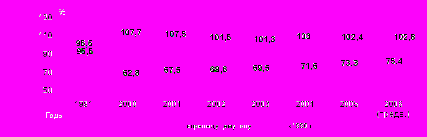 роизводство сельскохозяйственной продукции значительно уменьшилось. Объем валовой продукции сельского хозяйства в 2006 г. составил только 75% к уровню 1990 г., что иллюстрирует рисунок 1. Валовой сбор зерновых и зернобобовых культур снизился на 13,4% и составил в массе после доработки около 78 млн. т. Такой спад произошел не только в результате сокращения посевных площадей, но и из-за падения урожайности на 9,4%.