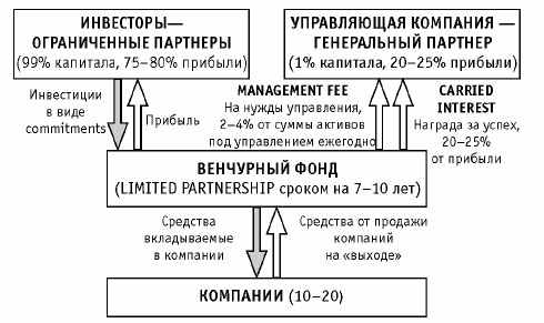 Инвестиционный капитал вкладывается в венчурный фонд, который находится под оперативным руководством управляющей компании (УК). Фонд, в свою очередь, приобретает доли в компаниях на ограниченный срок, обычно не более чем на 7-10 лет, до тех пор, пока рынок не будет способен вернуть вложенный капитал с существенной прибылью. Как правило, фонды инвестируют собранные средства в довольно большое число проектов (10-20) – это необходимая стратегия диверсификации рисков, поскольку значительная часть проектов может оказаться убыточной, но небольшая доля компаний может принести сотни процентов прибыли.