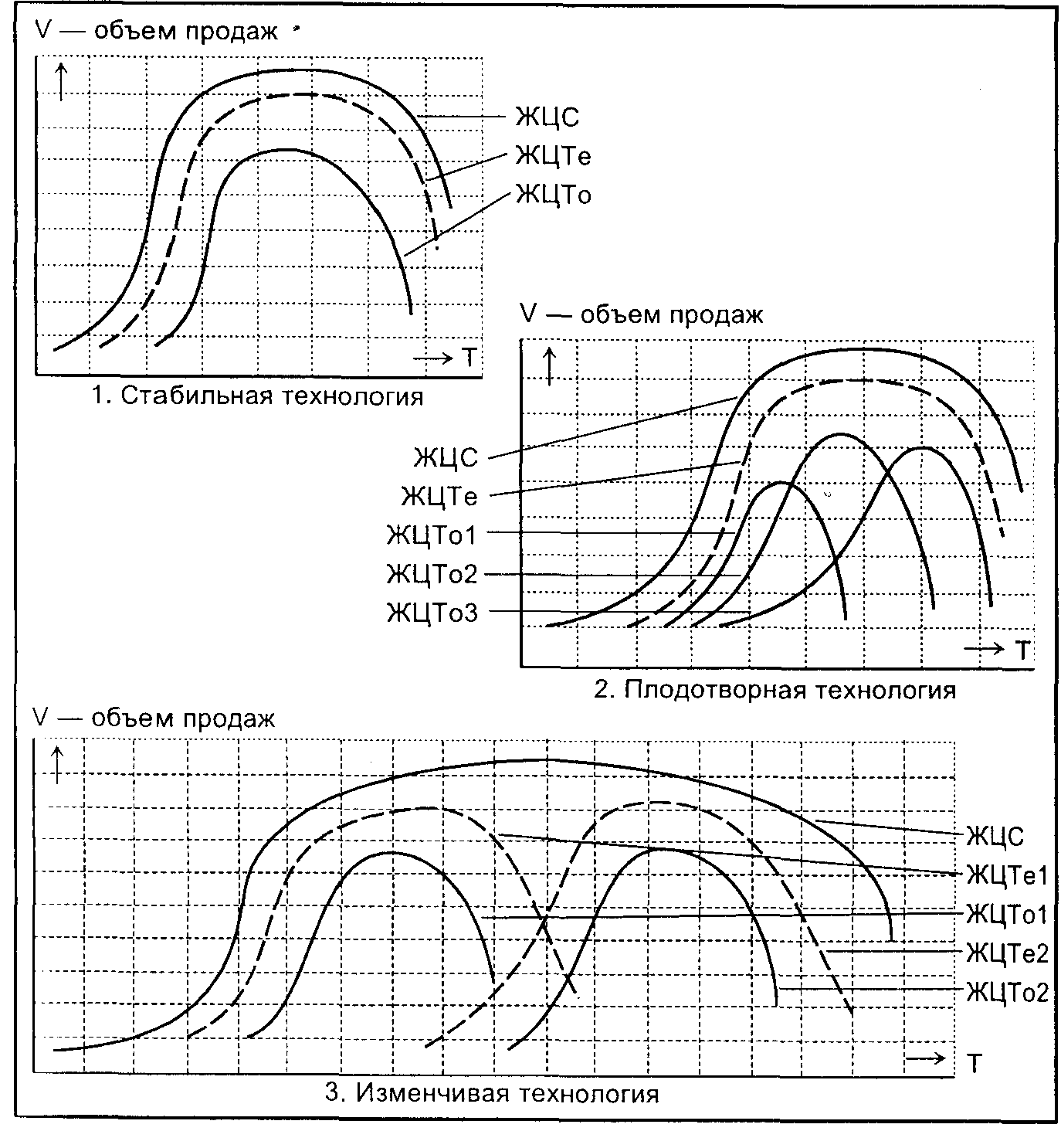 Стабильная технология в основном остается неизменной в течение ЖЦС (например, производство автомобилей ранних марок). Получается по одной кривой ЖЦС, ЖЦТе и ЖЦТо.